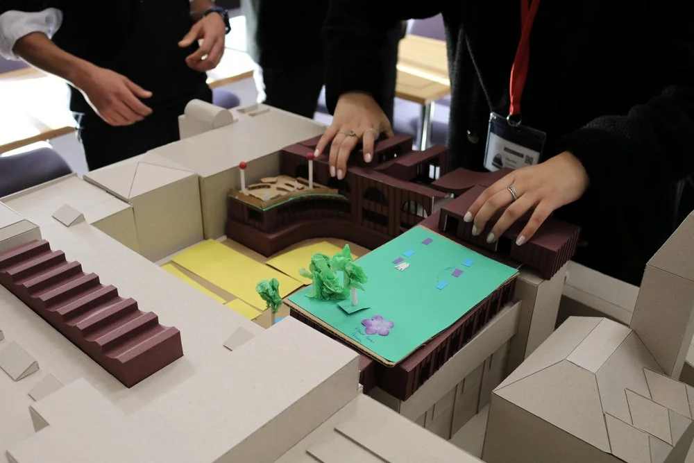 Testing the pupils’ proposals on a 1:100 model of the school as part of our series of participatory workshops with the school community.