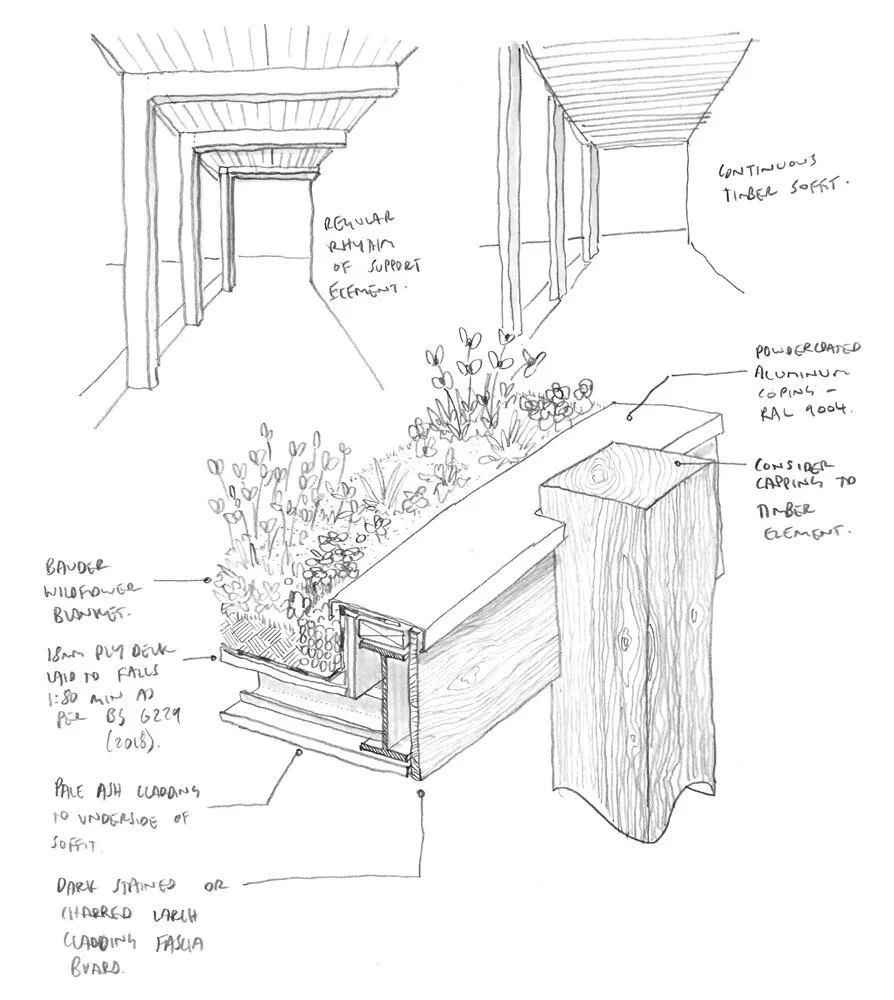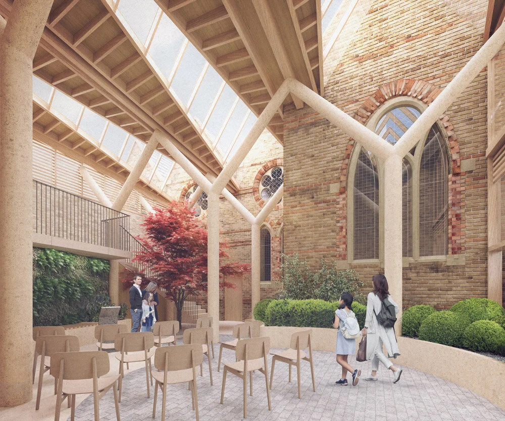 A Winter Garden will occupy a previously underutilised area of the site, bounded by the Grade II Listed Church of St Clements. The design is purposefully light-touch to respect the significant heritage features of the adjacent Church; spun concrete columns support an expressive vaulted timber lid to reference the gables and roofline of the Church. The space will support larger external events and educational workshops meaning that that the centre can continue to hold their important outreach activities in an external garden setting, all year round.