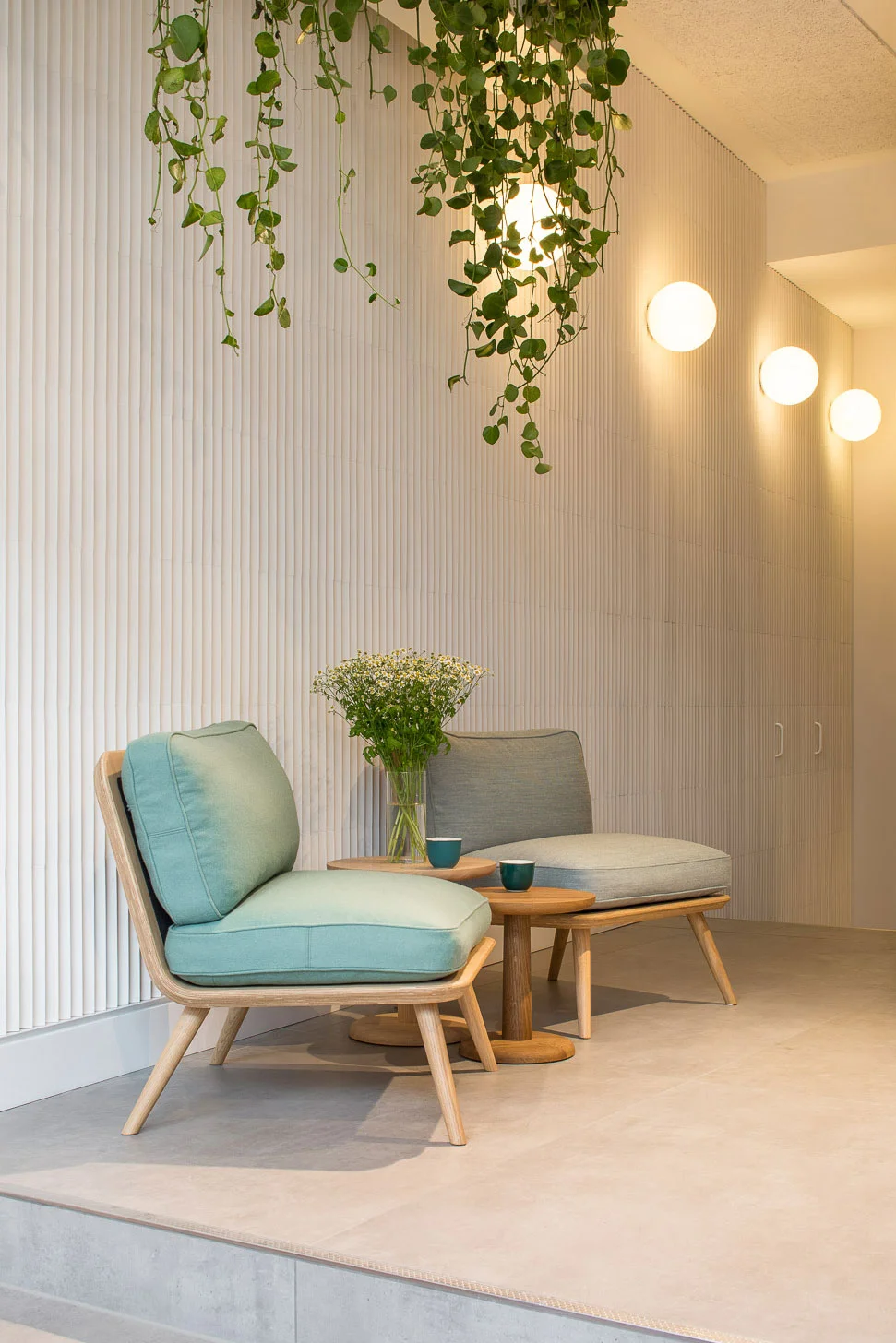 A consideration to transparency and openness runs as a common thread throughout the ground floor area. A meeting room within a central ‘greenhaus’ provides acoustic separation whilst maintaining a visual link with the main space. References to produce and horticulture enliven the space throughout, with high-level planting adding colour to the soft pastels of the interior. The basement level provides a darker, more intimate setting with lighting installations, patterned partitions and ceramic reliefs referencing the textures of the biscuit moulds of the wider Bahlsen heritage.