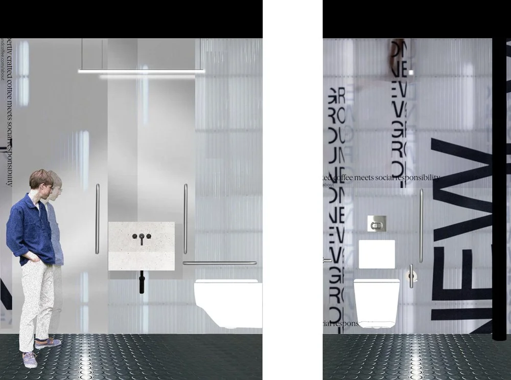 The overall concept for the café draws on NewGround’s mission statement, ‘expertly crafted coffee meets social responsibility’, with proposals that include a limited palette of colours with textural variations, and a design approach that is centred on celebrating the existing features of the unit.