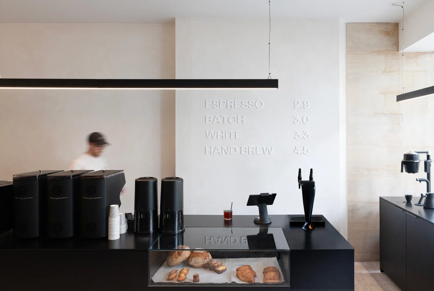 Paired back bench seating bounds the edges of the unit to face the customer inward, drawing their focus to the alchemy of coffee making and its performative nature, referencing the 17th century Coffee House. This immersive experience is foregrounded by two monolithic black coffee bars which act as stages, drawing the focus toward excellence and transparency of delivery.