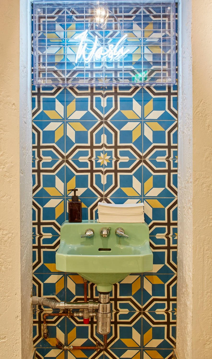 The interior finishes were deliberately left raw, with minimal touches in order to keep the space “intentionally simple, inexpensive and minimal”. Bespoke encaustic tiles line both the floor and walls, taking cues from Arabic interiors and typography. A showcase of selected artworks adorns the walls, referencing Istanbul markets, spinning dervishes and dining families. Bespoke neon signage provides wayfinding throughout the space: from menu options, condiment units and hand-wash stations.