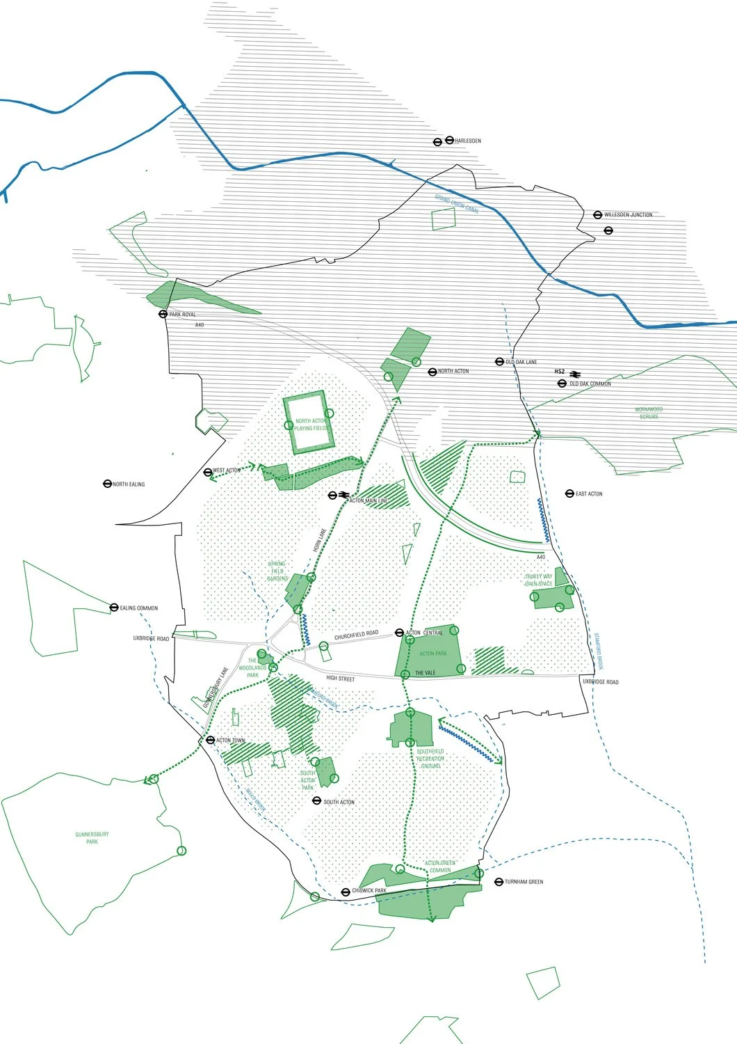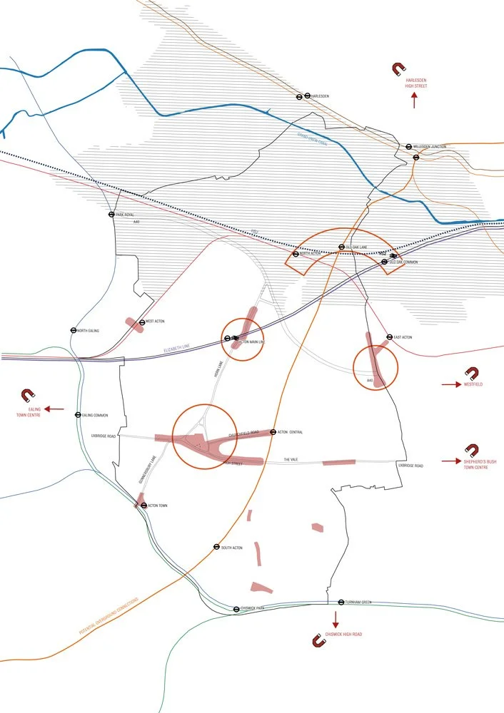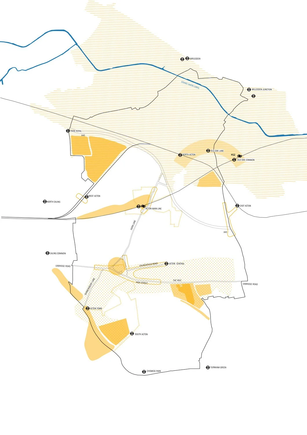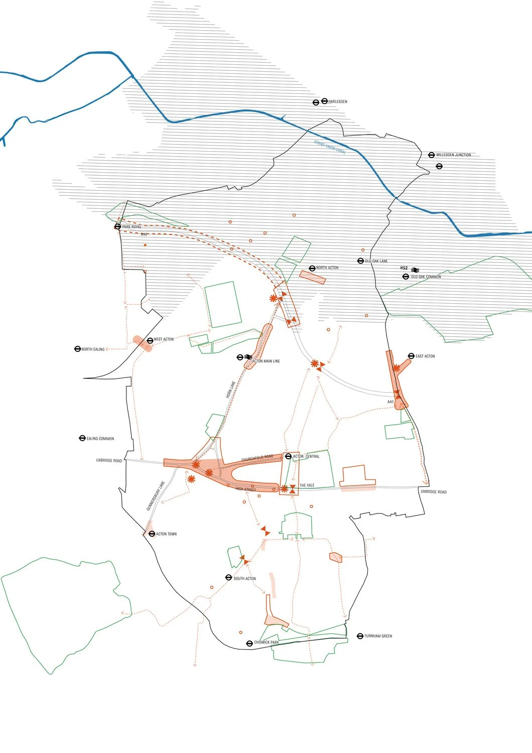 The study encompassed a large area across the multiple distinct neighbourhoods, green spaces and town centres of Acton, its varied urban grain and contrasting economic outlooks. Industrial zones and transport infrastructure create severance between many parts of the area and define its overall boundaries, which will see future change via HS2 and regeneration in OPDC to the North.