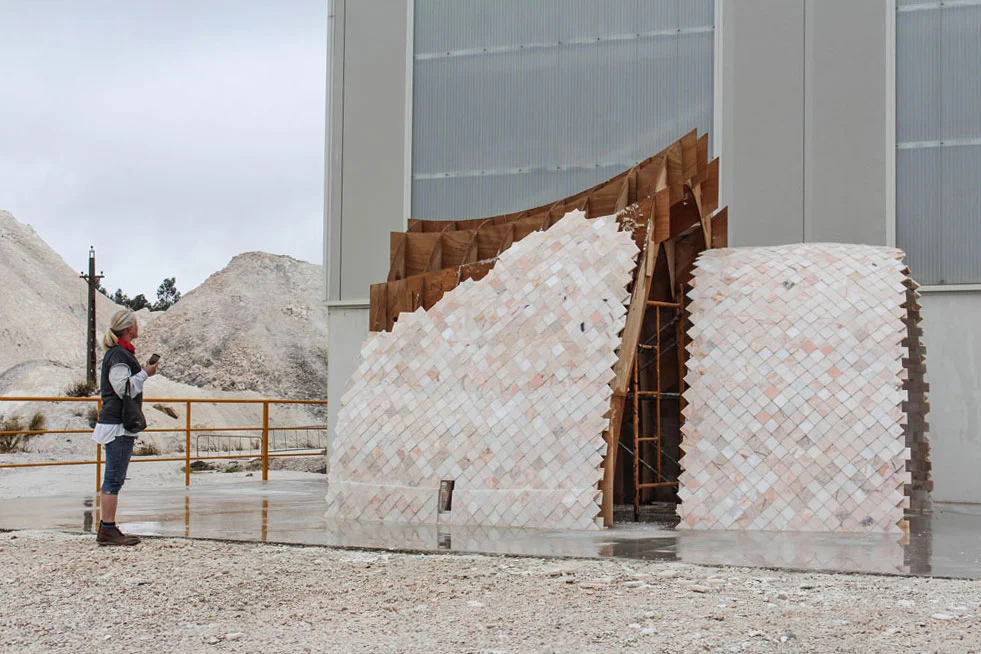 We worked alongside Cultural Geometries, a group comprising architects, engineers, designers and students to build, by hand, the first non-reinforced marble structure for over a century; moreover one of the first to be exclusively built from marble waste.